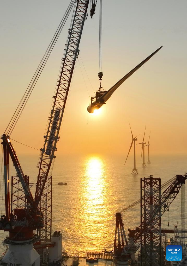 This drone photo taken on Jan. 13, 2026 shows one of the turbine blades being installed at the construction site of a 20-megawatt offshore wind turbine unit in the coastal waters of southeast China's Fujian Province. The wind turbine unit was successfully hoisted and installed here on Tuesday. (Xinhua/Lin Shanchuan)