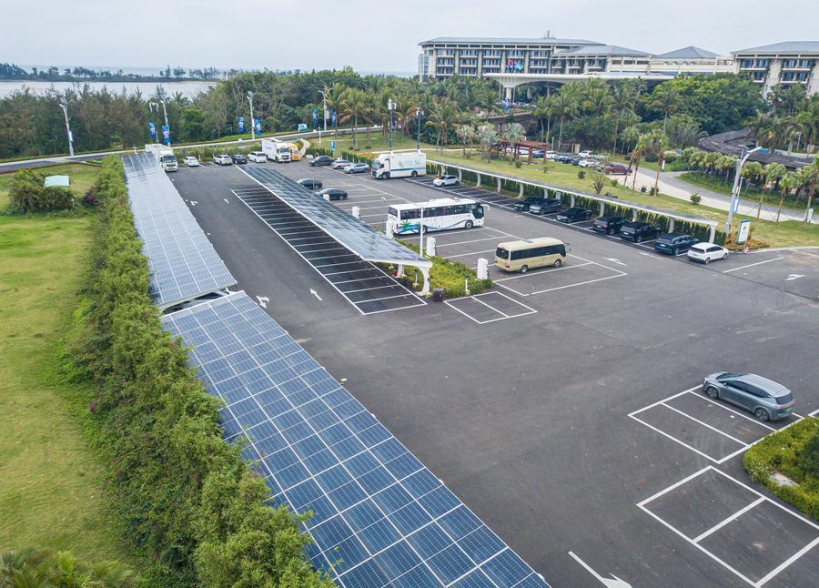 An aerial drone photo taken on March 16, 2025 shows the photovoltaic devices at a parking lot in the Boao zero-carbon demonstration zone in Boao, south China's Hainan Province. (Xinhua/Pu Xiaoxu)
