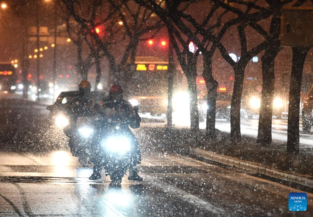 People wait at a red light amidst snowfall in Beijing, capital of China, on Jan. 17, 2026. Beijing witnessed a snowfall on Friday. (Xinhua/Chen Yehua)