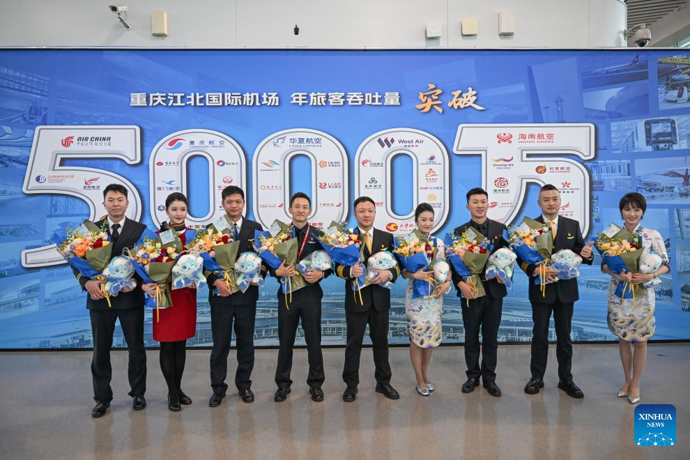 Crew members pose for a group photo in front of the commemorative wall marking the annual passenger throughput exceeding 50 million of Chongqing Jiangbei International Airport in Chongqing, southwest China, Dec. 31, 2025. The combined economic output of southwest China's Sichuan Province and Chongqing Municipality has exceeded 10 trillion yuan (about 1.44 trillion U.S. dollar) in 2025, accounting for approximately 7.2 percent of the national total. (Xinhua/Chen Cheng)