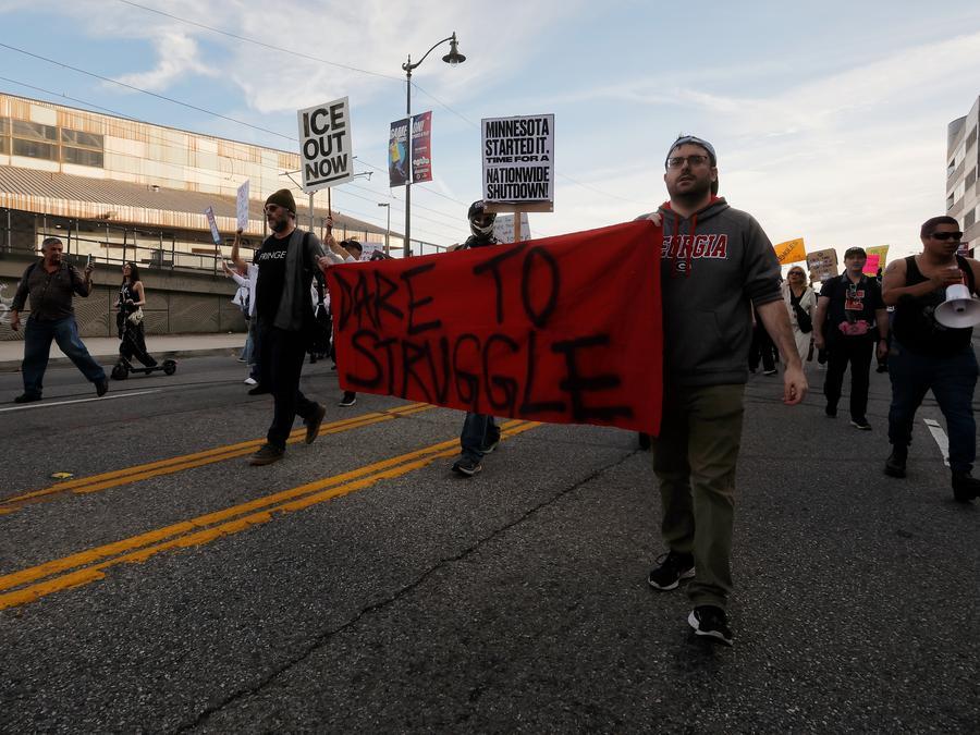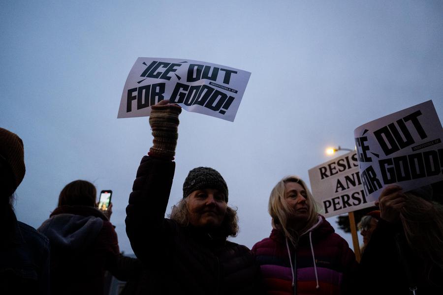 Protesters attend a rally against the U.S. Immigration and Customs Enforcement (ICE) near the Metropolitan Detention Center in downtown Los Angeles, California, the United States, on Jan. 25, 2026. (Xinhua)
