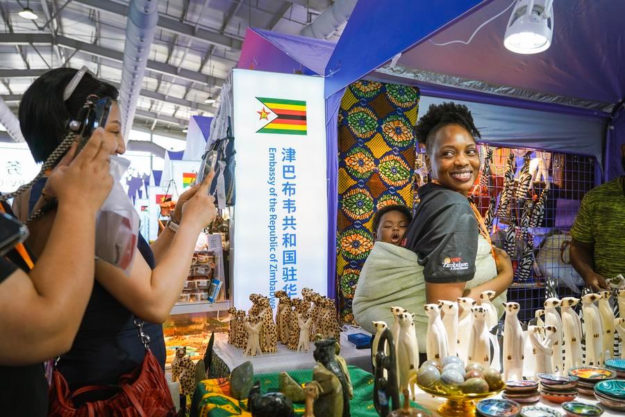 A staff member communicates with visitors at the booth of Embassy of the Republic of Zimbabwe during the 2024 China International Fair for Trade in Services (CIFTIS) at the Shougang Park in Beijing, capital of China, Sept. 14, 2024. (Xinhua/Cao Mengyao)