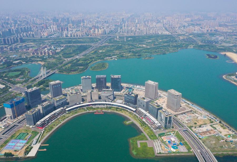 An aerial drone photo taken on July 15, 2025 shows a financial island in Zhengzhou, central China's Henan Province. (Xinhua/Hao Yuan)