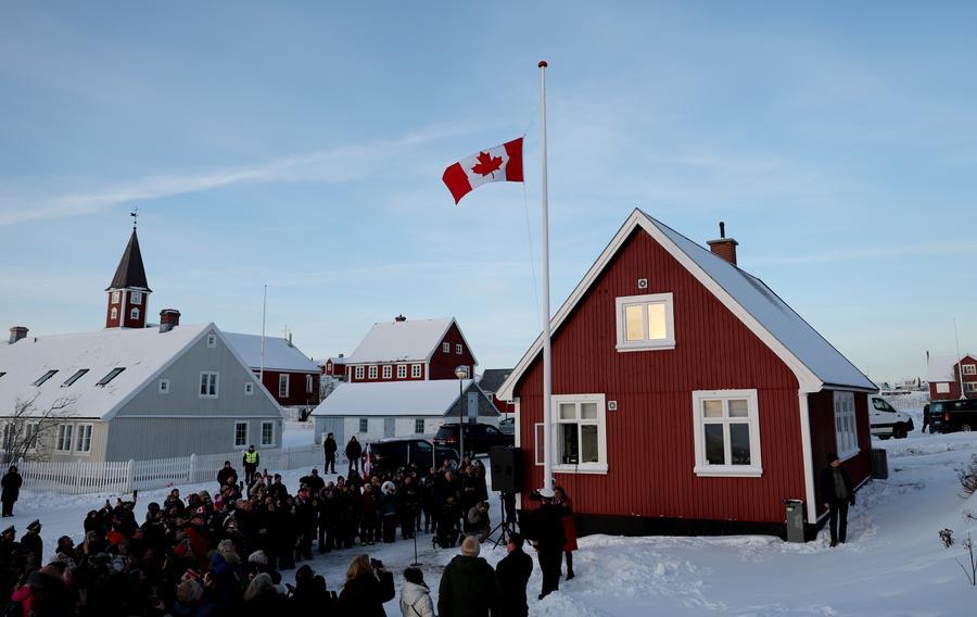 People raise Canadian flag during the opening ceremony of Canada's new consulate in Nuuk, the capital of Greenland, Denmark, Feb. 6, 2026. On Friday, France and Canada each opened a consulate in Nuuk. (Xinhua/Li Ying)