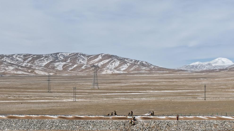 An aerial drone photo taken on Feb. 6, 2026 shows staff members of the Wangkun Line maintenance workshop in Golmud section under China Railway Qinghai-Xizang Group Co., Ltd. maintaining the rail along the Qinghai-Xizang Railway in northwest China's Qinghai Province. (Xinhua/Qi Zhiyue)