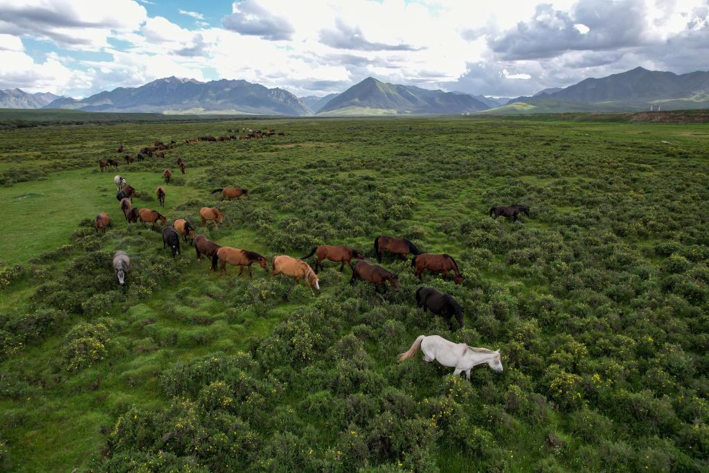 A drone photo shows a herd of horses foraging at the Shandan Horse Breeding Farm in northwest China's Gansu Province, July 10, 2024. (Xinhua/Lang Bingbing)