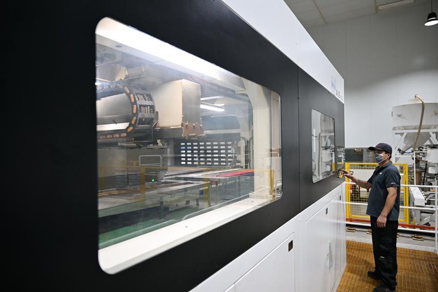 A worker operates a 3D printing machine at a casting company in Botou, north China's Hebei Province, Sept. 24, 2025. (Xinhua/Mu Yu)