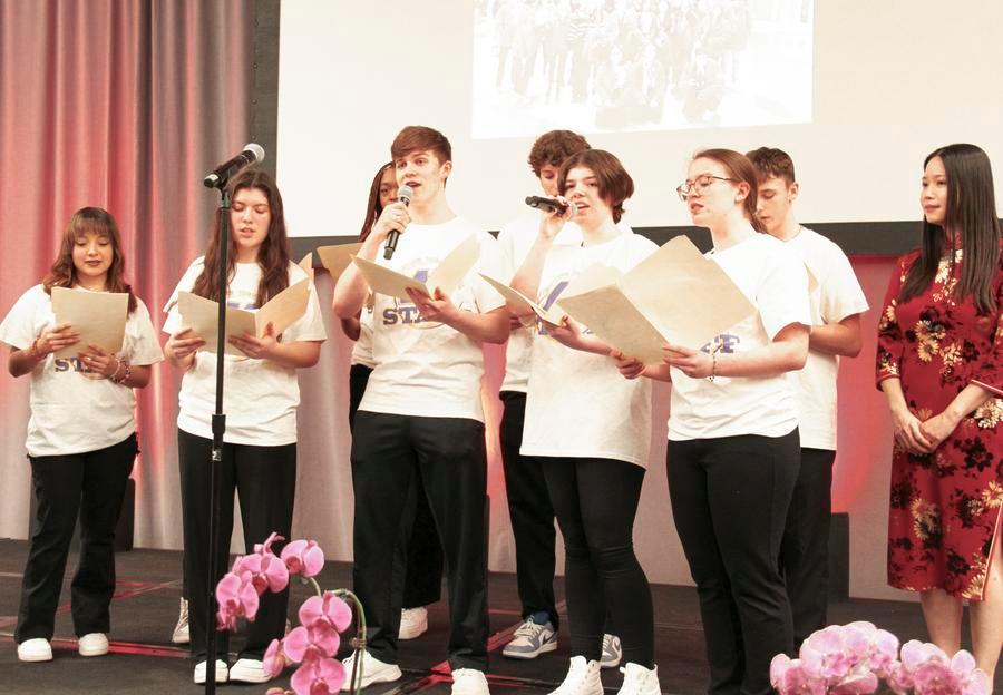 Students from Muscatine High School sing a song in Chinese at a reception marking the 45th anniversary of the establishment of China-U.S. diplomatic relations in Chicago, the United States, Feb. 27, 2024. (Xinhua/Xu Jing)
