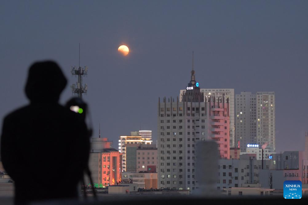 A citizen photographs a total lunar eclipse over Qiqihar City, northeast China's Heilongjiang Province, March 3, 2026. Tuesday marked the Lantern Festival, which falls on the 15th day of the first month of the Chinese lunar calendar. This year's festival coincided with a total lunar eclipse. (Photo by Wang Yonggang/Xinhua)