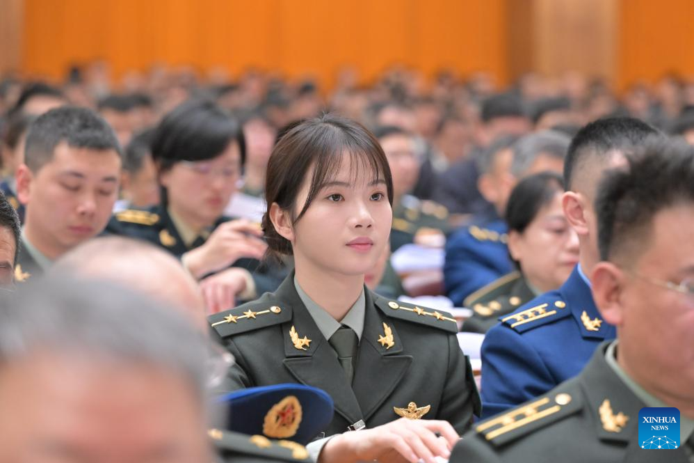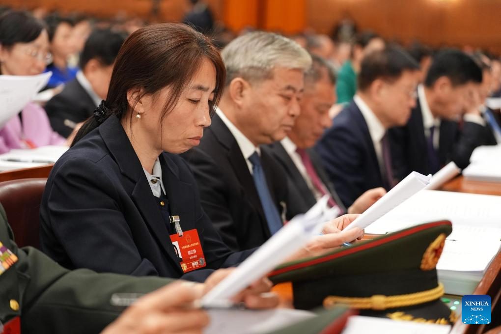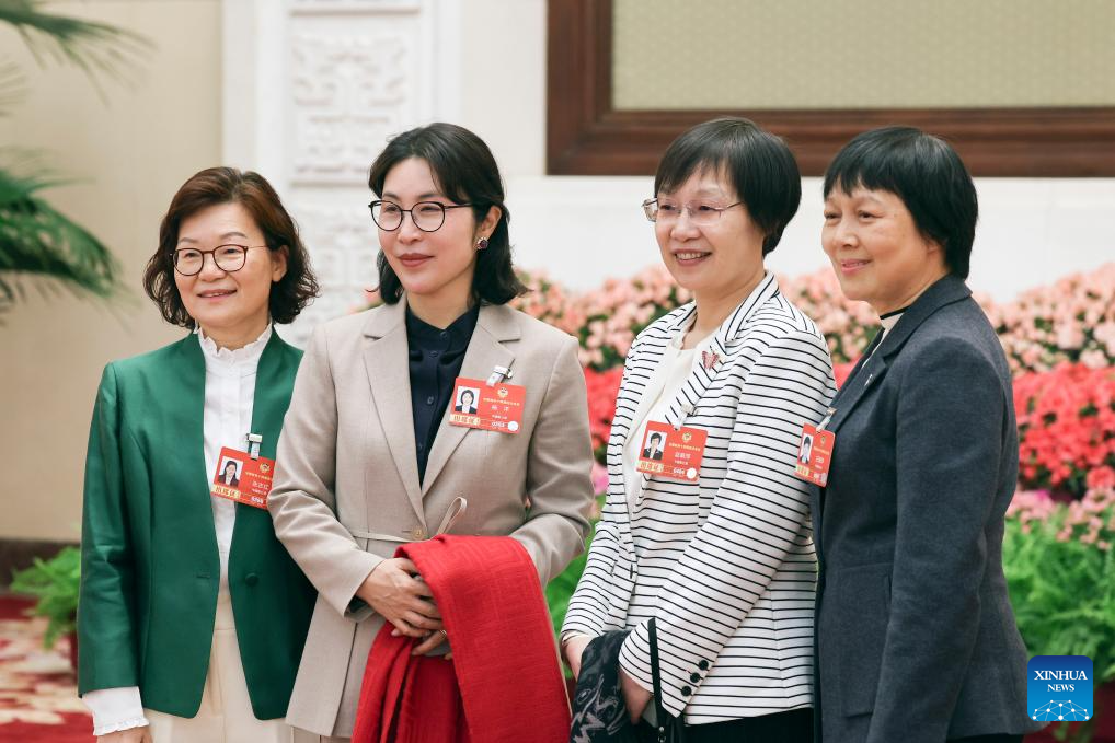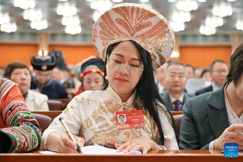 Jin Ruirui (2nd L), a deputy to the 14th National People's Congress (NPC), attends the opening meeting of the fourth session of the 14th NPC at the Great Hall of the People in Beijing, capital of China, March 5, 2026.