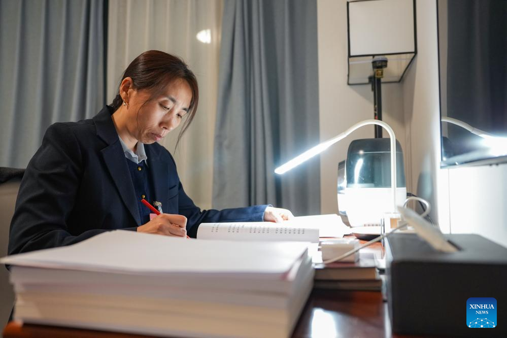 Guo Hongjing, a deputy to the 14th National People's Congress (NPC), reads the government work report in Beijing, capital of China, March 6, 2026.