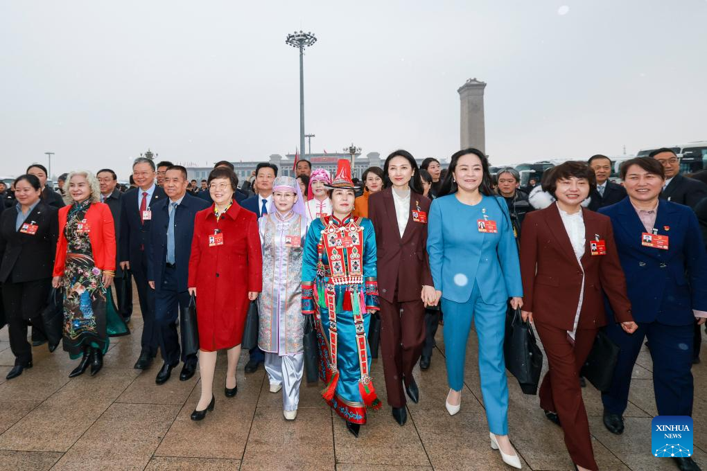 Zhang Qiongli (2nd R, front), a deputy to the 14th National People's Congress (NPC), attends the opening meeting of the fourth session of the 14th NPC at the Great Hall of the People in Beijing, capital of China, March 5, 2026.