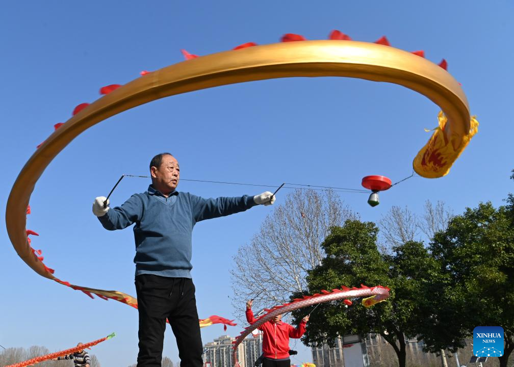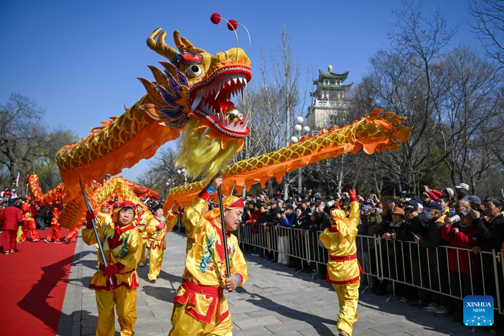 Artists stage a dragon dance performance at a park in north China's Tianjin, on March 20, 2026. The spring equinox falls on March 20. This year, it also marks Longtaitou, also known as Dragon Head-raising Day, a significant occasion in the lunar calendar, celebrated by various activities across China. (Xinhua/Sun Fanyue)
