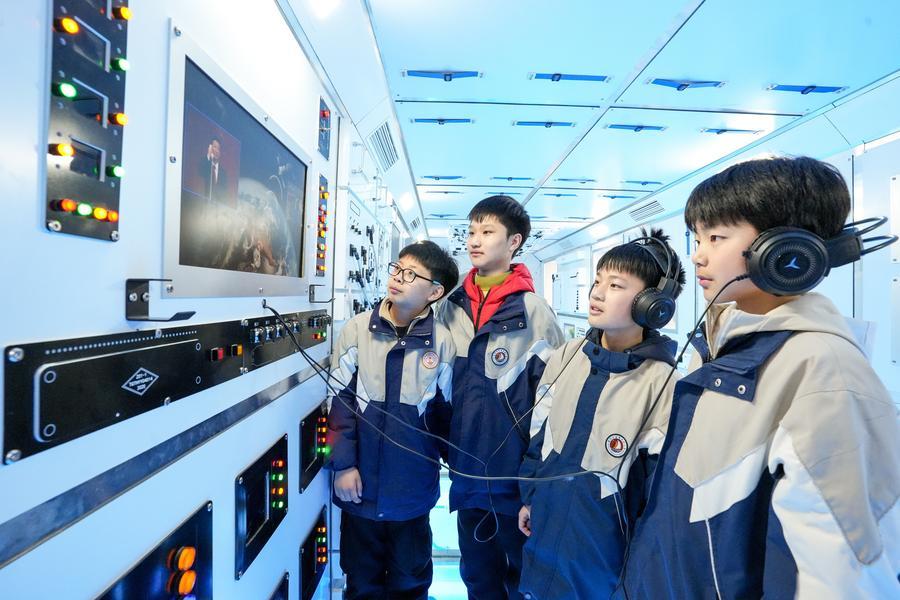 Students visit a mock space capsule at an aerospace science education center during the spring break in Sheyang County of Yancheng, east China's Jiangsu Province, April 1, 2026. (Photo by Peng Ling/Xinhua)