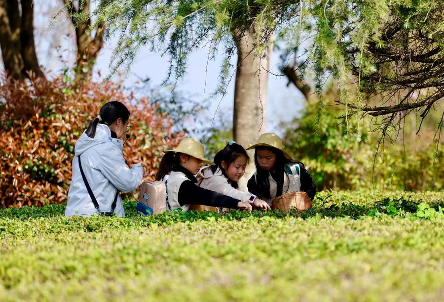 Students pick tea leaves at a tea garden during the spring break in Huangshan City, east China's Anhui Province, April 1, 2026. (Photo by Shi Yalei/Xinhua)
