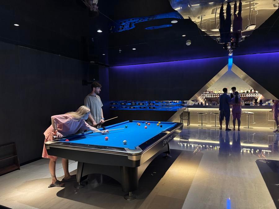 Foreign tourists play pool at a hot spring resort in Shanghai, east China, April 3, 2026. (Xinhua/Huang Anqi)