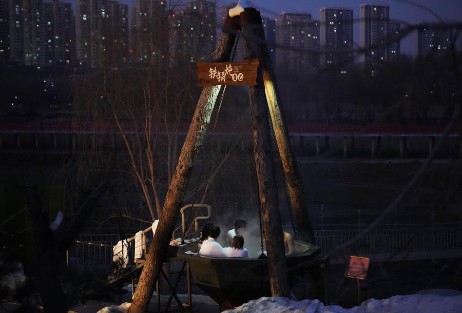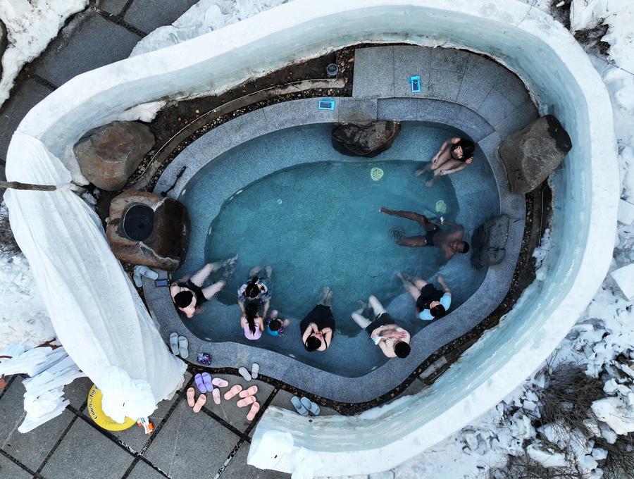Visitors enjoy a hot bath in a giant iron pot at a hot spring resort in Shenyang, northeast China's Liaoning Province, Jan. 17, 2025. (Xinhua/Li Gang)