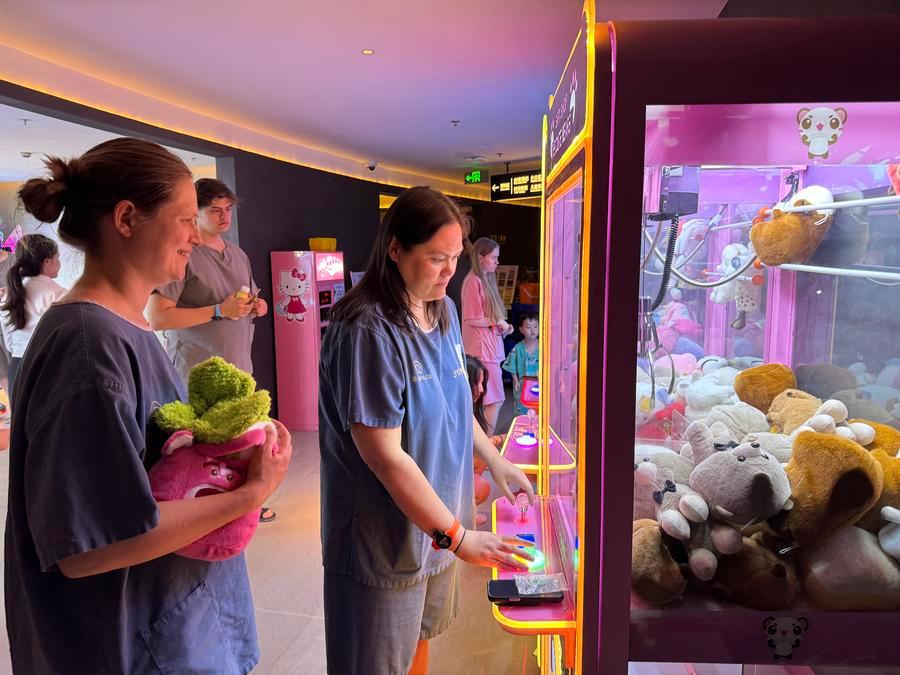 Foreign tourists play with a claw machine at a hot spring resort in Shanghai, east China, April 3, 2026. (Xinhua/Huang Anqi)